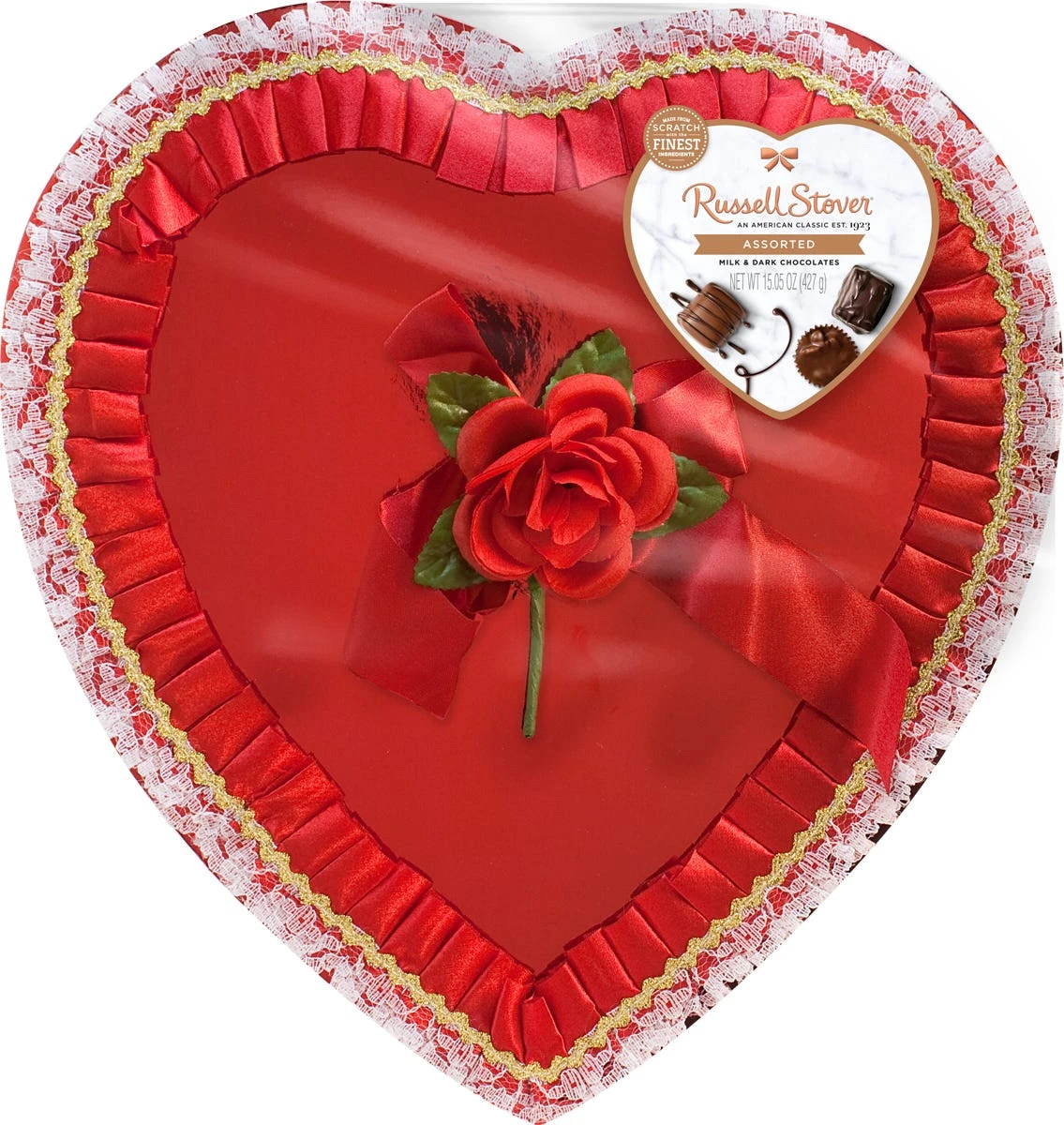 This classic, lace and ruffle Valentine assorted Chocolate Heart Box is adorned with a romantic red rose and one of our best selling Valentine’s Day Gifts