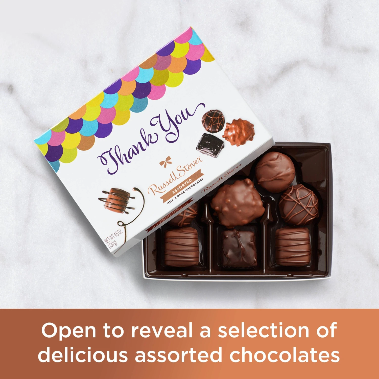 Is there a better way to say thank you to someone than with dark and milk chocolates made from scratch in a beautiful copper-foil giftbox? This 4.6-ounce box is the perfect as a gift for one person or a group to enjoy the delicious variety of chocolates inside and share a moment of joy.