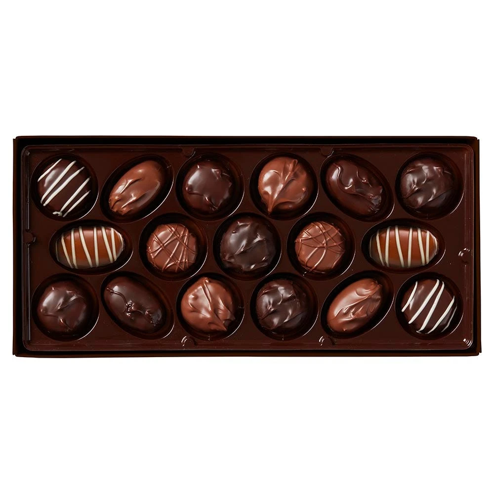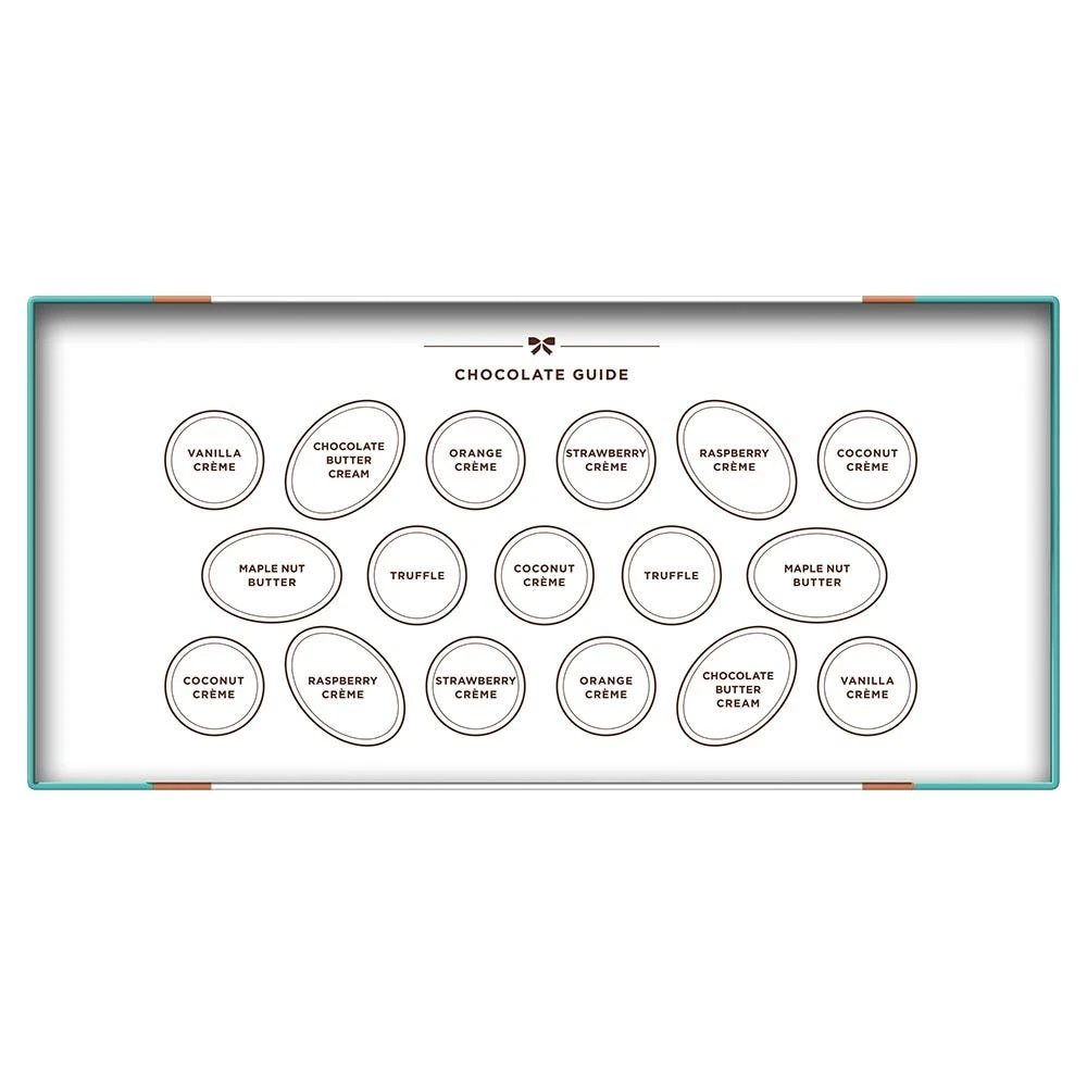 With soft creamy centers nestled inside coatings of smooth dark chocolate or rich milk chocolate this assortment of treats will excite the most discerning palate. This copper-foil gift box collection includes butter creams chocolate butter strawberry creams and delectable chocolate truffles.