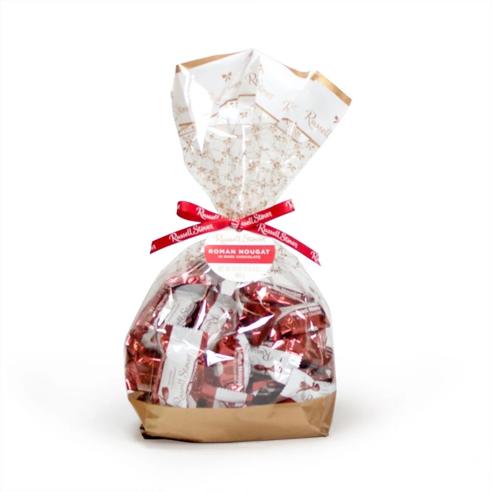24 oz. of delicious roman nougat individually wrapped candies that feature a chewy center made with cherries and nuts enrobed in rich dark chocolate.