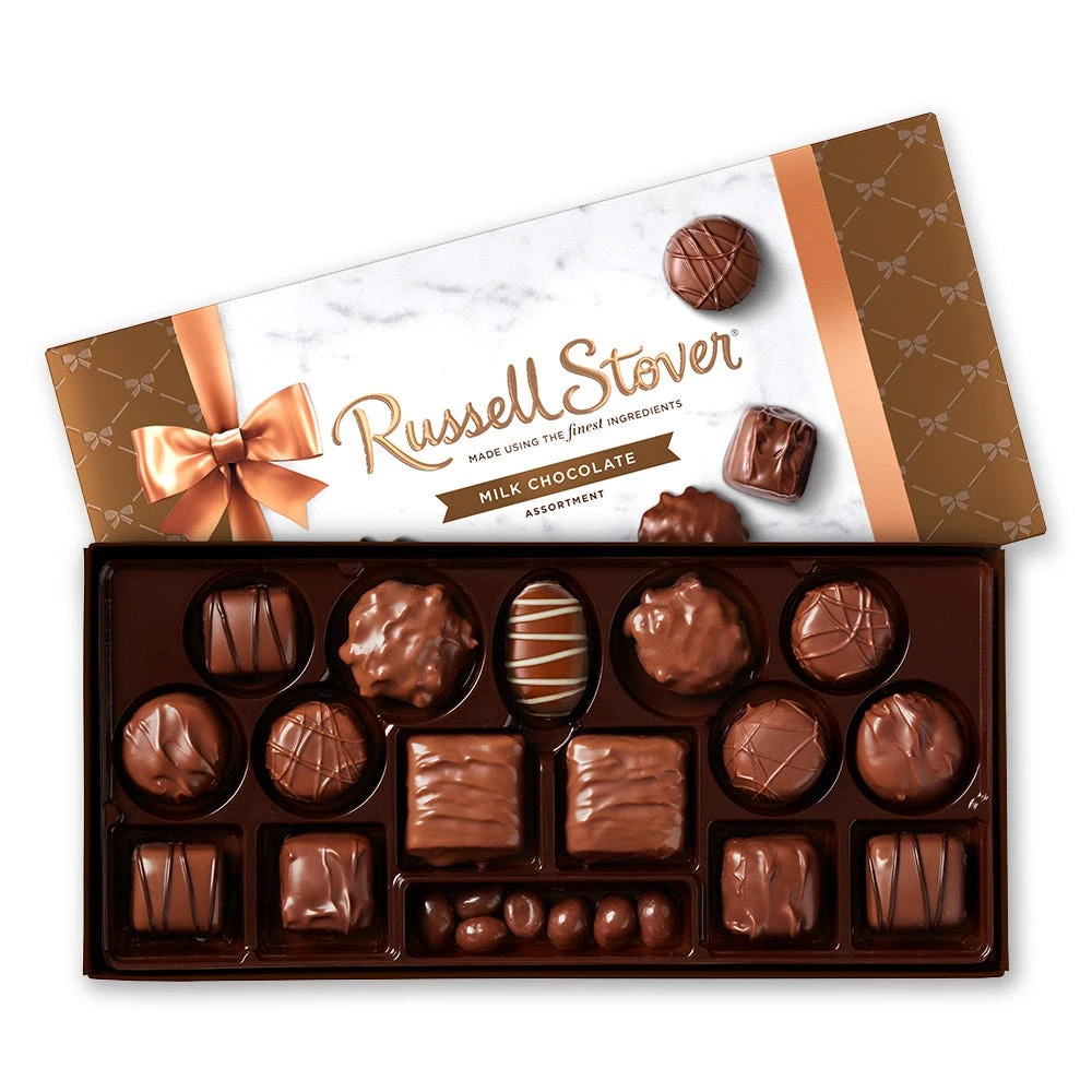 This 9.4-ounce assorted milk chocolate candy box contains a variety of pieces handcrafted with fillings such as caramel truffle toffee and pecan delight. Russell Stover candies are generously covered with chocolate and each piece is an American classic.