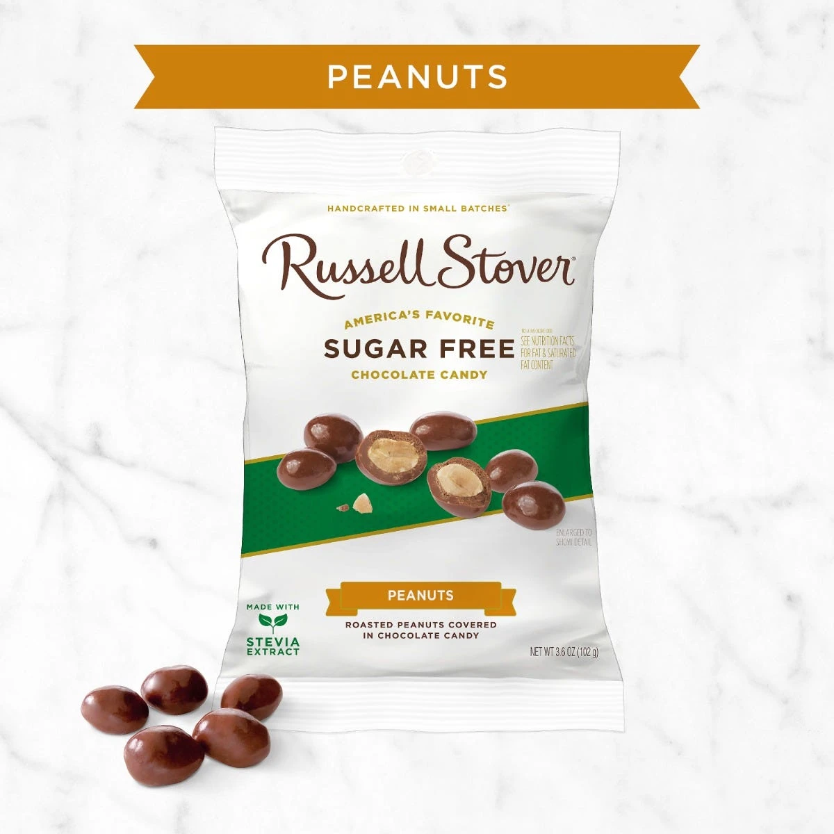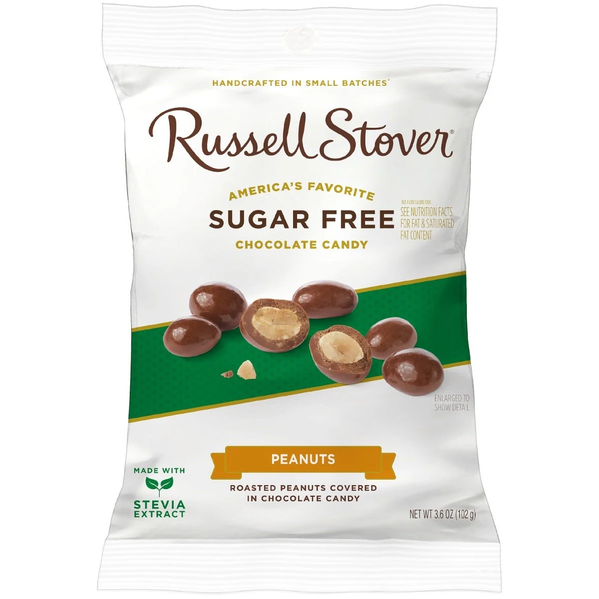 Enjoy the timeless taste of sweet and salty. The Russell Stover Sugar Free Chocolate Covered Peanuts come in a 3.6-ounce bag. The peanuts are covered in a rich chocolate candy that is made with Stevia Extract.
