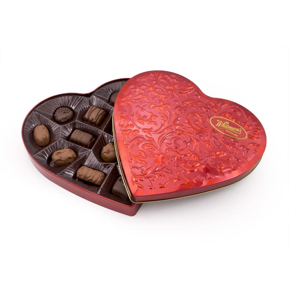 A beautiful Valentine’s Day embossed tin filled with a classic assortment of Whitman’s Sampler dark and milk chocolates. This heart-shaped tin will is ideal for holding treasures dear to their heart.